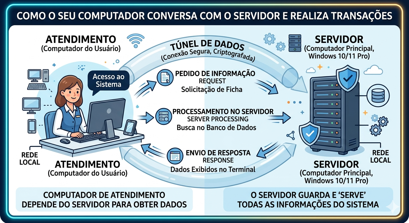Diferente do servidor, o computador de atendimento (também chamado de Terminal) geralmente não guarda as informações importantes dentro dele. Ele apenas as "pega emprestado" do servidor para mostrar na tela.